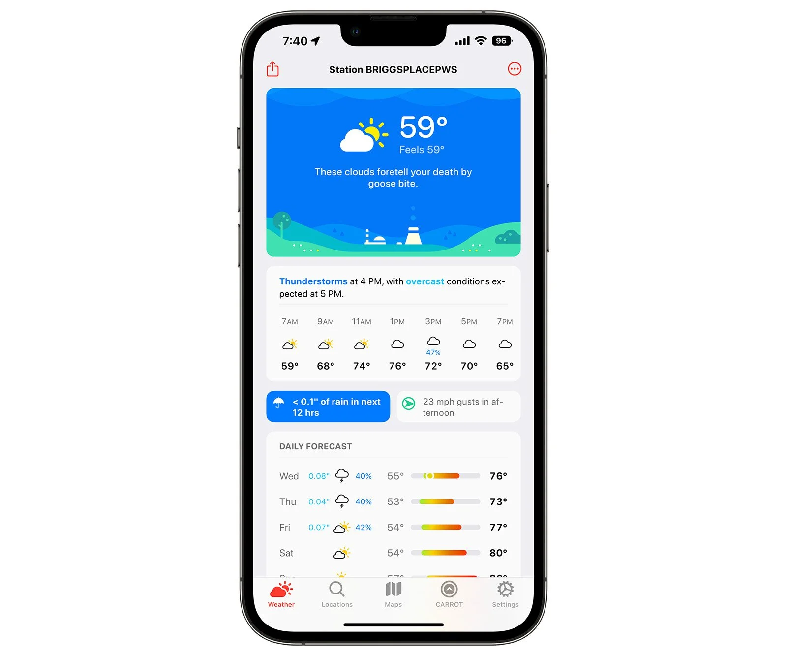 Apple seriously upgraded the iOS Weather app after acquiring DarkSky, and it’s really great. It seems weird to pay for a weather app when the default one is so nice, but CARROT is just too good.