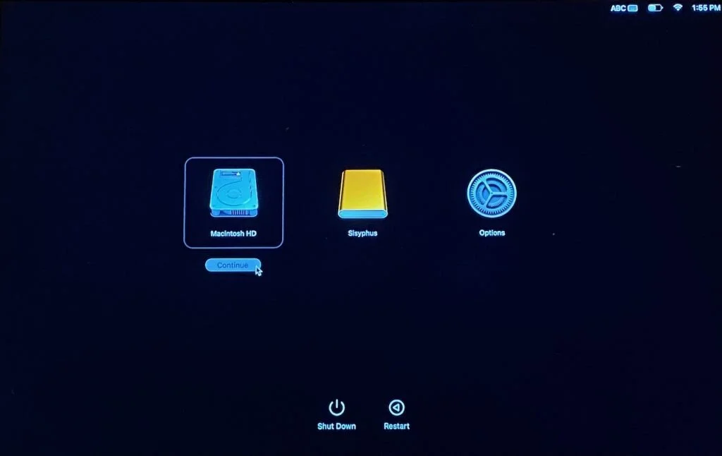 If you have multiple boot drives and wish to switch among them, you’ll want to use Startup Manager. Immediately after you see “Loading startup options…,” the Mac displays the new Startup Manager, which shows icons for all the bootable drives, along with buttons for Options, Shut Down, and Restart. To boot from a particular drive, select it and click Continue under it.